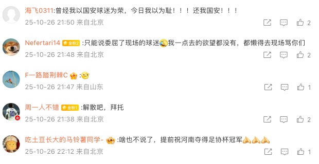 不少球迷直言国安脸都不要了:“毫无意外,大周末继续恶心人!”:“解散吧,大家都累了!”:“演都不演了是吧!”:“足协杯就算踢个冠军我都不觉得光荣!”:“这真是卖球送温暖啊!后面还有两支保级球队,六分也都给了呗,这样谁也不得罪!”