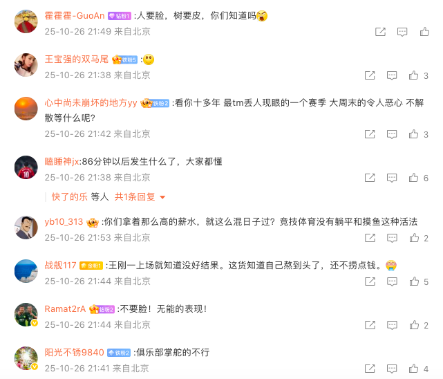 不仅是法比奥,北京球迷面对俱乐部糟糕的表现也彻底怒了。赛后国安官微发布的本场战报下面,再次被球迷爆破怒冲。